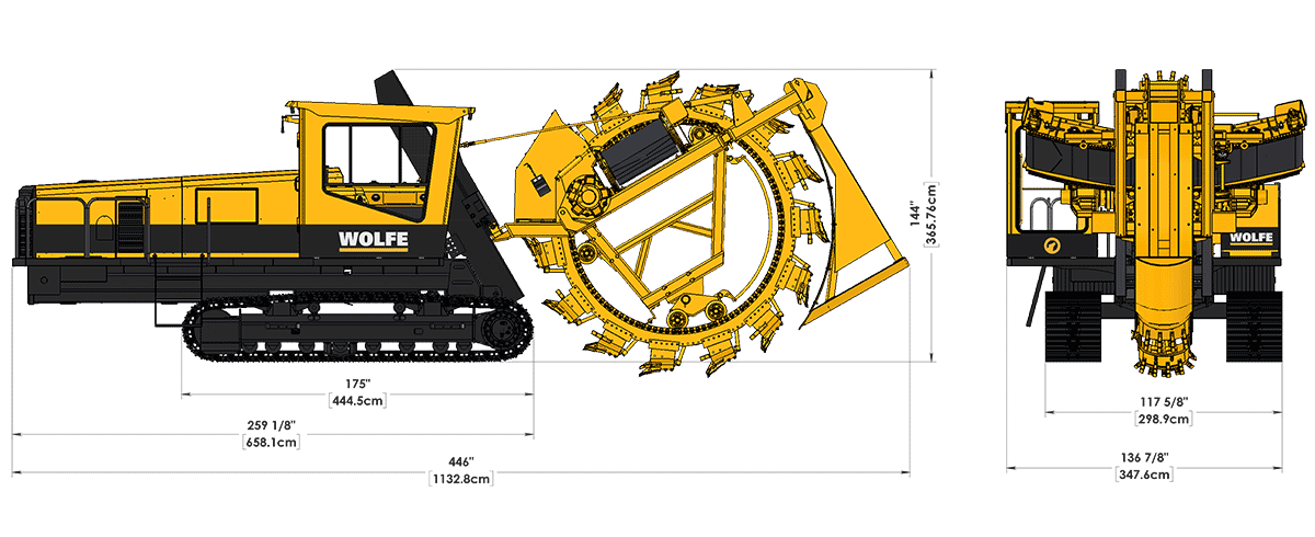 The Wolfe 8000 features a wheel with a maximum trench depth of 8 ft. [244cm] and up to 46" [117cm] trench width.